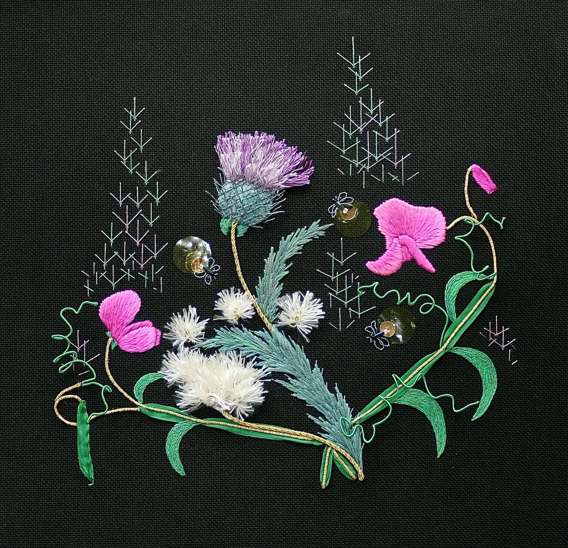 Dogwood flowers are stitched on silk organza in several techniques within wired long and short blanket stitch: long and short and sequins. Centers are raised twists of Gilt Sylke Twist and beads. Branches are assembled with dark wire and flowers to cantilever over the Mountain Laurel.