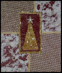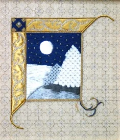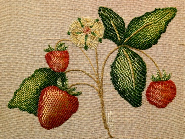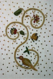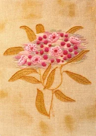 Working over a laid silk foundation the superimposed flowers of Mountain Laure are worked in silks with both padded satin and long and short stitches. Flower markings are red silk and beads. Stamens with anthers are raised above with Gilt Sylke Twist combined with beads. Buds are worked in raised spider using twisted silk. The detached leaves are worked in close couched wired organza.