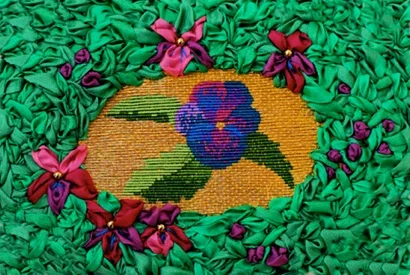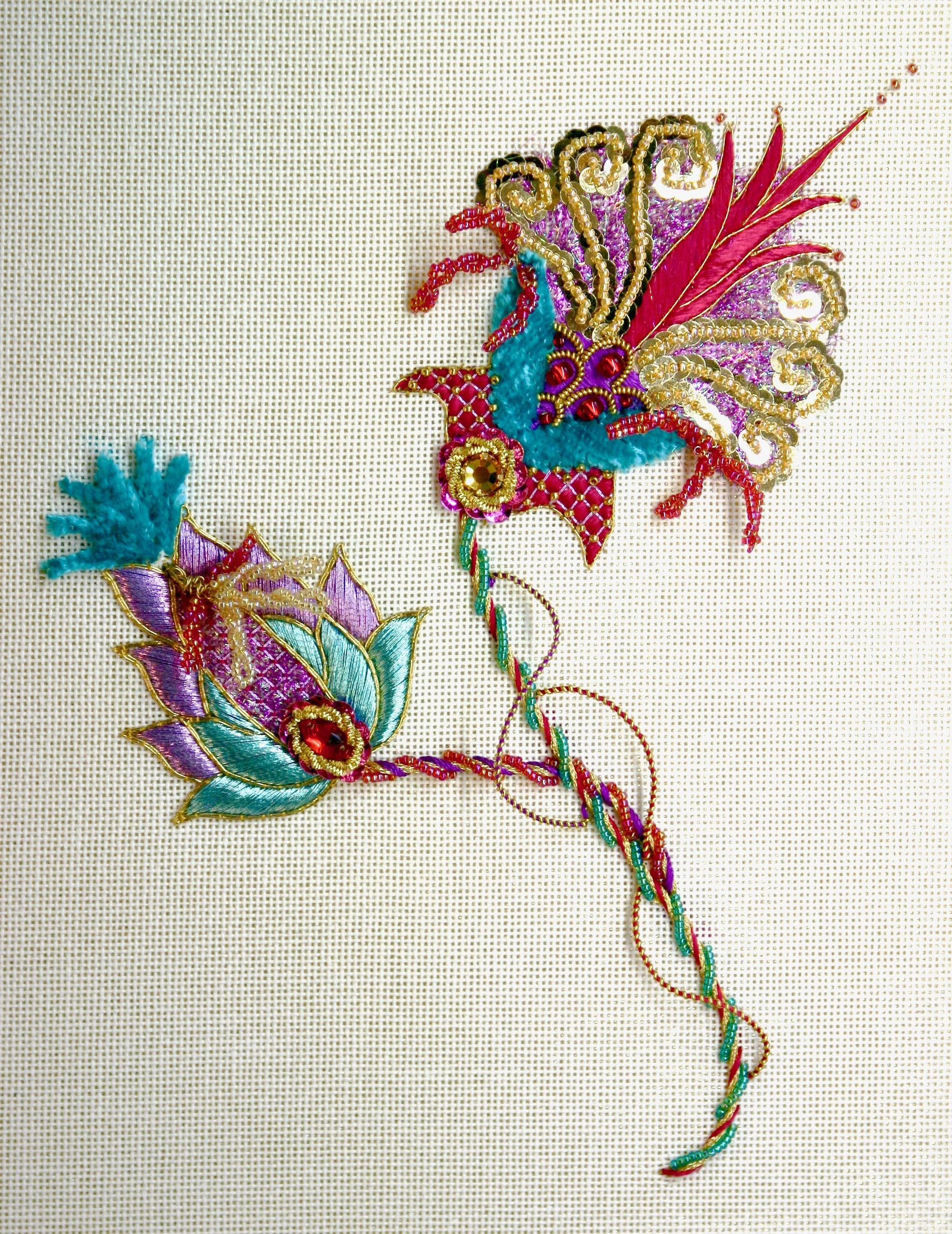 Size: 7" x 9" x 3" design on 12" x 14" silk fabric foundation
