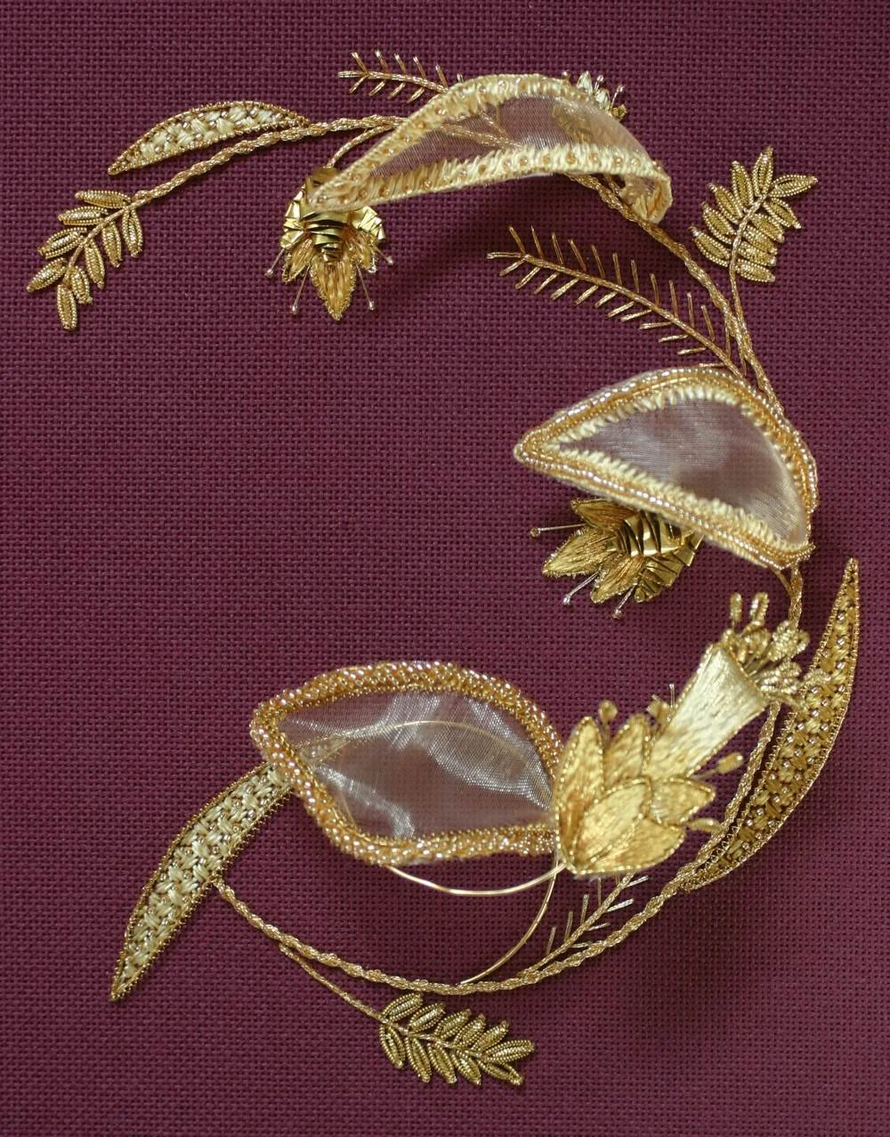 Hand twisted braid combines with pearl purl to form the foundation on which, the detached elements work their magic. The detached elements are worked separately on sheer fabric in the creation of this exquisite embroidery. Milliary, check purl and pearl purl are used in various combinations throughout along with gold foil, beads and several gauges of wire.